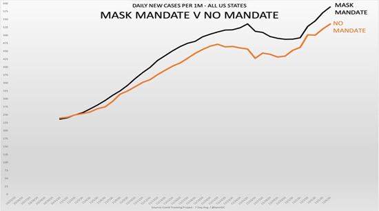 Figure 2 below shows that the effect of the graduated mask mandate was non-existent and also confirms that cases rose after the mandate.